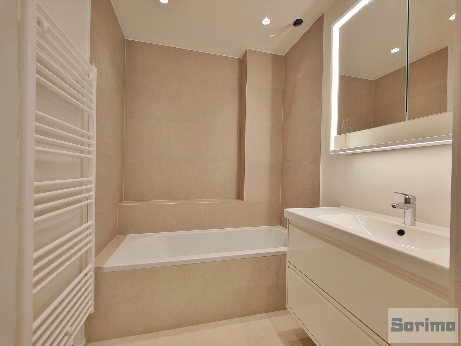 - Salle de bains de +/- 3,5 m² (bain avec paroi de douche, meuble lavabo et sèche-serviette) (carrelage)