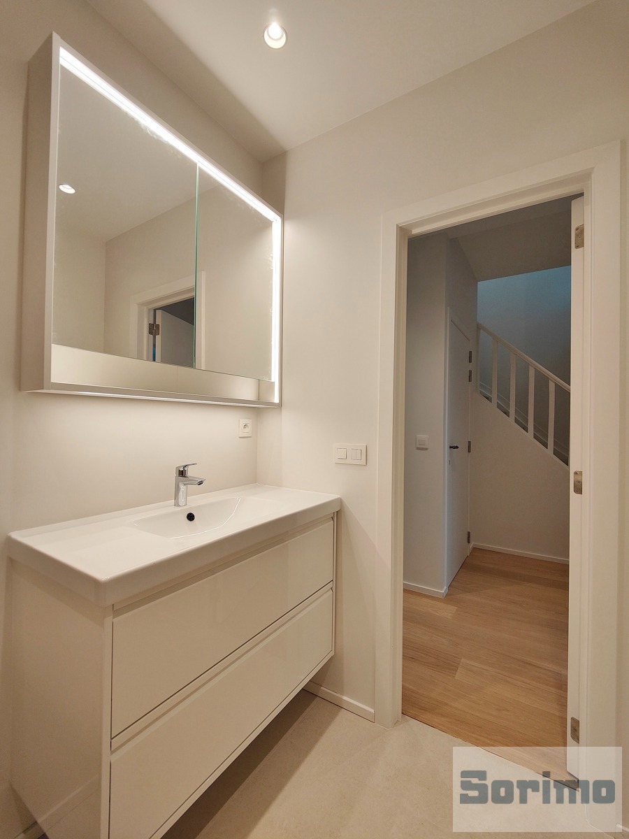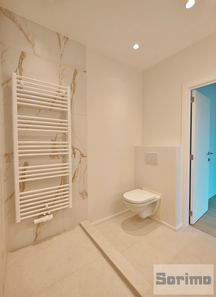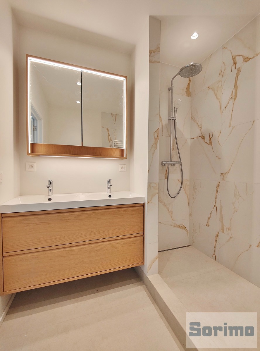 - Salle de douche privative de +/- 4,8 m² (douche, meuble double lavabo, sèche-serviette et toilette) (carrelage)