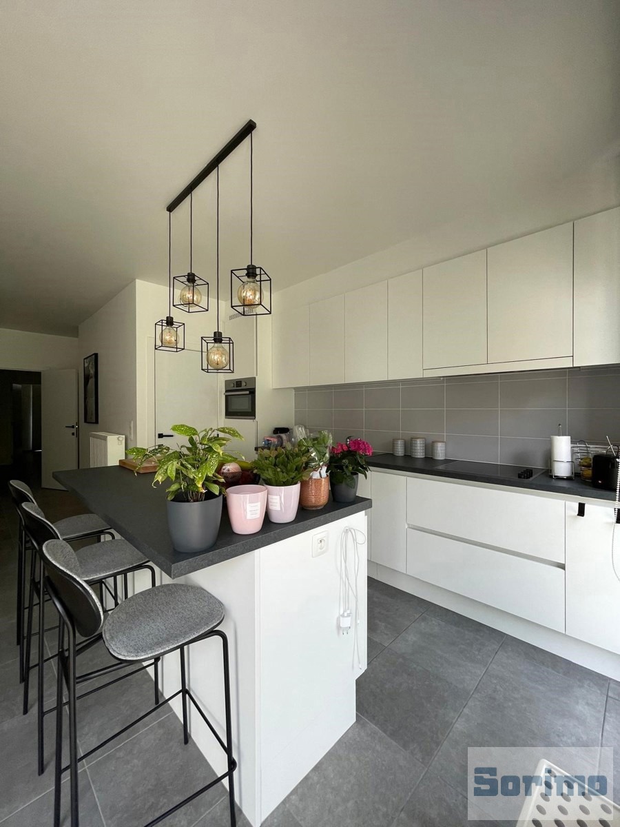 In de nabijheid van de Duitse school, in een rustige en residentiële wijk, prachtig appartement op het gelijkvloers van ongeveer 87 m², ingedeeld als volgt:
